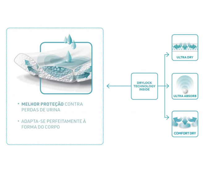 - Segurança: As barreiras antivazamento e o núcleo superabsorvente garantem proteção total contra vazamentos, mesmo em casos de incontinência severa