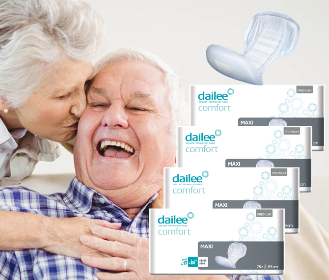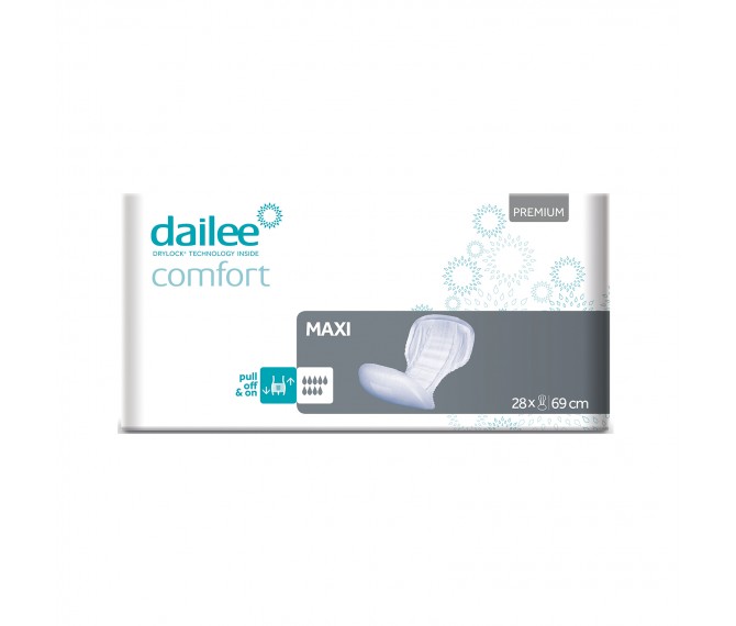 O penso Dailee Comfort Premium Maxi é um penso de incontinência de grande dimensão (69cm), com o formato anatómico tipo fralda, mas sem as abas de aperto na cintura, concebido para proporcionar conforto e proteção para incontinência intensa.