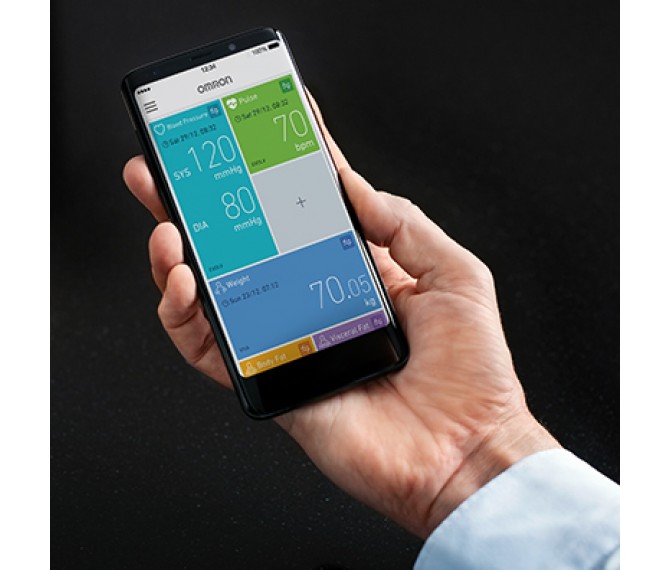 Aceda a qualquer hora e consulte o progresso através da aplicação móvel para iPhone/Android™, aplicação OMRON connect.