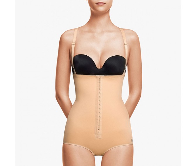A abertura da cinta, para facilitar ao vestir, no pós-operatório imediato, faz-se através duma fileira de colchetes na parte anterior. Os colchetes têm 3 posições, permitindo, por isso, reduzir o tamanho da cinta, depois de diminuído o edema e a inflamação da parte intervencionada. Parte inferior aperta com colchetes. Abrange a partir da área submamária até à anca, com alças.