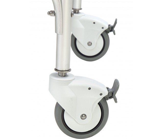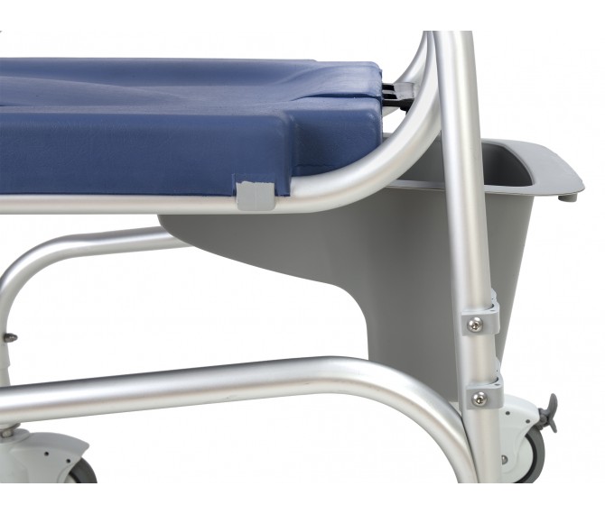 Cadeira sanitária e de banho com 4 rodas, duas com travão, apoio de braços fixo e sem apoio de pés. Este modelo possui duas funções distintas que juntam o útil ao agradável, sem mais complicações.