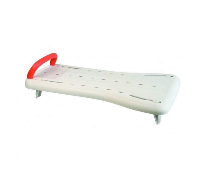 Tábua de banheira com pega lateral. Fabricada em polipropileno que garante a segurança do utilizador. O dispositivo permite ao utilizador realizar a sua transferência para a banheira e tomar o seu banho com comodidade e segurança. A tábula de banheira com pega lateral foi concebida para ser aplicada em banheiras com largura entre 43 e 68cm. O dispositivo possui orifícios para escoamento de líquidos que facilitam a limpeza e higiene do dispositivo.