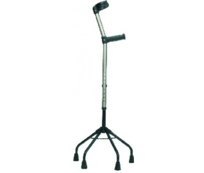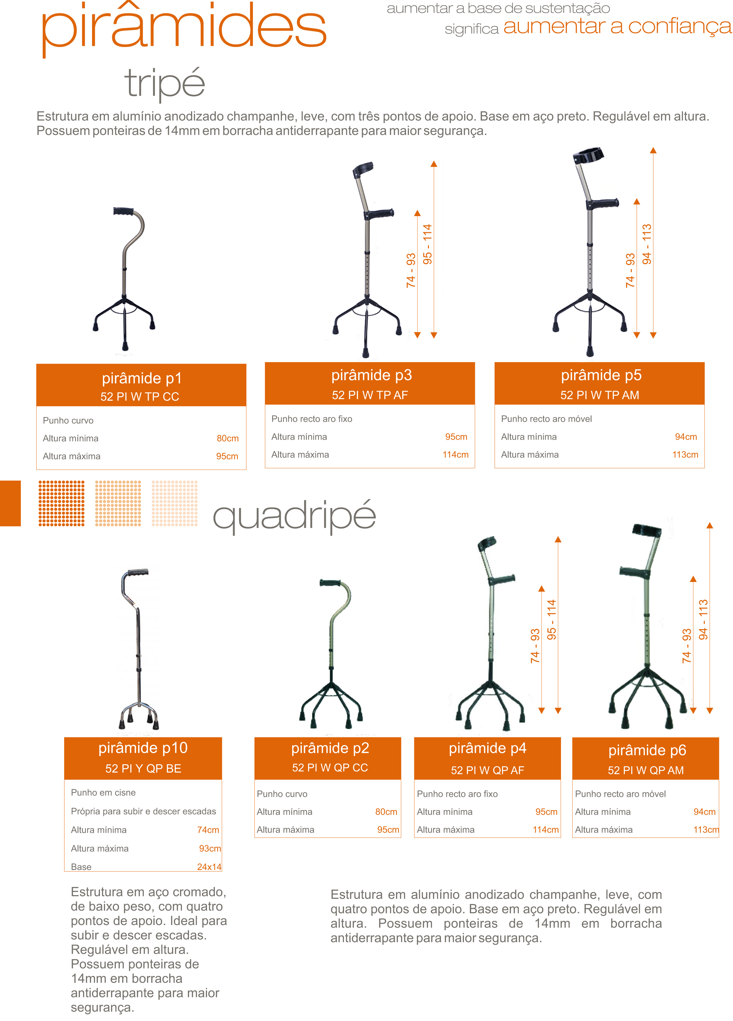 Estrutura em alumínio anodizado champanhe, leve, com quatro pontos de apoio. Base larga em aço preto. Regulável em altura, com apoio do antebraço e aro fixo. Possuem ponteiras de 14mm em borracha antiderrapante para maior segurança. Altura de 74 a 93cm.