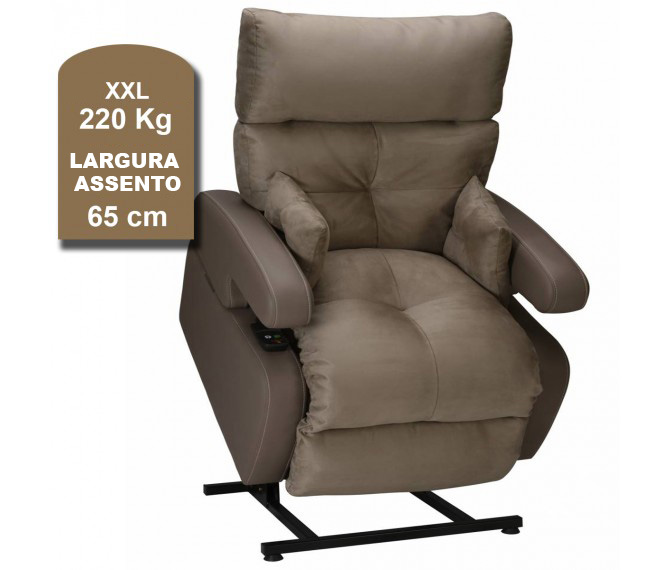 Cadeirão reclinável elétrico com Elevação modelo Cocoon Versão XXL (bariátrica) para pessoas com peso até 220 kg. Com uma largura de assento de 65 cm e uma profundidade de 55 cm. O cadeirão COCOON é um sofá elevatório elétrico multiposição e ultraconfortável que facilita o acesso a cuidados e transferências graças aos seus braços dobráveis e removíveis.