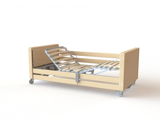 Estrutura em tubo de aço macio. Estrado articulado em réguas de faia, tripartido, acionado por motor elétrico. Altura regulável por dois motores elétricos colocado nas cabeceiras. Guardas laterais em MDF. Suporte nas duas extremidades da cabeceira para receber pendural ou haste de soro (pendural ou haste de soro opcionais). Leito quadripartido em réguas de faia, articulado em 3 partes por motor elétrico acionado por comando de mão permitindo a elevação em altura de 350 a 750mm e a posição de Trendelenburg e Anti-Trendelenburg através dos motores instalados nas cabeceiras.