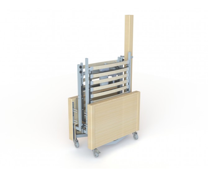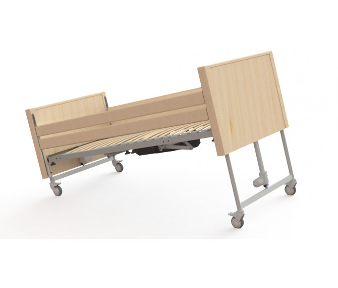 Estrutura em tubo de aço macio. Estrado articulado em réguas de faia, tripartido, acionado por motor elétrico. Altura regulável por dois motores elétricos colocado nas cabeceiras. Guardas laterais em MDF. Suporte nas duas extremidades da cabeceira para receber pendural ou haste de soro (pendural ou haste de soro opcionais).  Leito quadripartido em réguas de faia, articulado em 3 partes por motor elétrico acionado por comando de mão permitindo a elevação em altura de 350 a 750mm e a posição de Trendelenburg e Anti-Trendelenburg através dos motores instalados nas cabeceiras.