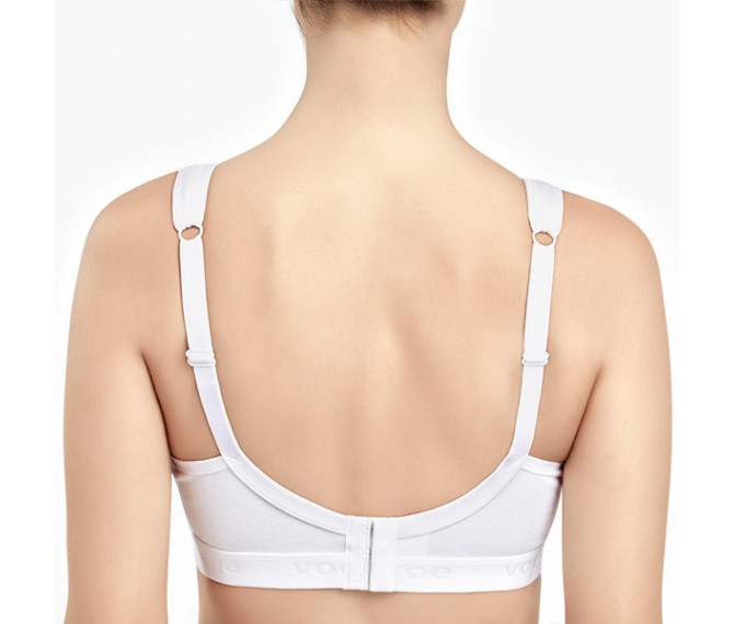 Soutien para aumento e redução mamária VOE® 2012-VF. Modelo exclusivo VOE com indicação para aumento e redução mamária, abertura frontal com fecho éclair, regulável nas costas. Fabricado com alta percentagem de algodão, com copas pré formadas (sem costuras), com copa dupla e alças acolchoadas.