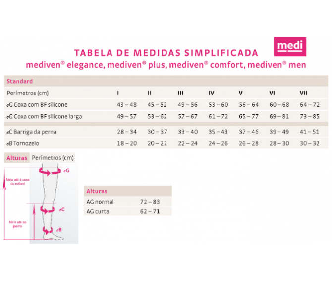 Consulte o catálogo para informação adicional e a tabela de medidas para as instruções de medição e escolha correta do tamanho. O tamanho das meias elásticas não é escolhido a olho nem pelo tamanho do sapato. A perna deve ser corretamente medida e essa medição irá corresponder a um tamanho específico da tabela. .