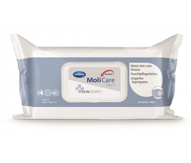 Toalhetes humedecidos Molicare® Skin (Menalind) sem álcool, para uma limpeza rápida de áreas da pele muito sujas, como por exemplo, em casos de incontinência. Indicadas para uma limpeza rápida e prática da área genital, com pantenol nutritivo e óleo de amêndoas doces. Como em toda a gama de produtos para limpeza Molicare® Skin (Menalind), estes toalhetes limpam profundamente a pele madura, apresentando substancias que respeitam o pH e preservando o mando ácido da pele.