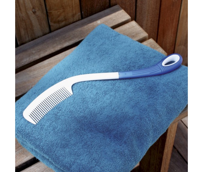 Pente de cabo longo, ergonomicamente curvado para se adaptar à forma da cabeça, que permite pentear o cabelo com o mínimo de esforço, segurando-o junto ao corpo.
