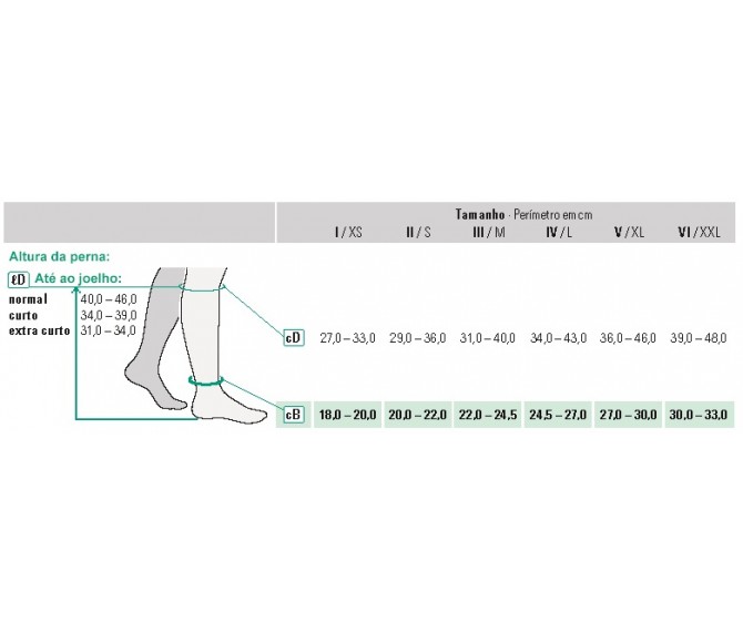 As meias elásticas são um dispositivo médico no qual só com tiragem de medidas se consegue ter a compressão clinicamente correta em toda a perna. Usar um tamanho maior ou menor que o correto só fará o utente piorar, correr riscos desnecessários e daí surgirem problemas graves que são totalmente evitados com o uso do tamanho certo! Não brinque com a sua saúde! Consulte a tabela de medidas do artigo. As medidas devem sempre ser tiradas logo ao início da manhã, a pessoa deve estar de pé, com as pernas afastadas e o peso distribuído pelas duas pernas. Para uma meia até ao joelho, apenas precisa tirar 3 medidas: Tornozelo, barriga da perna e altura da perna (ver na tabela de medidas o local onde deve tirar essas medidas). Para medir a altura de perna deve estar de pé e medir a altura da perna pelo interior da mesma, desde a base do calcanhar até dois dedos abaixo do joelho.