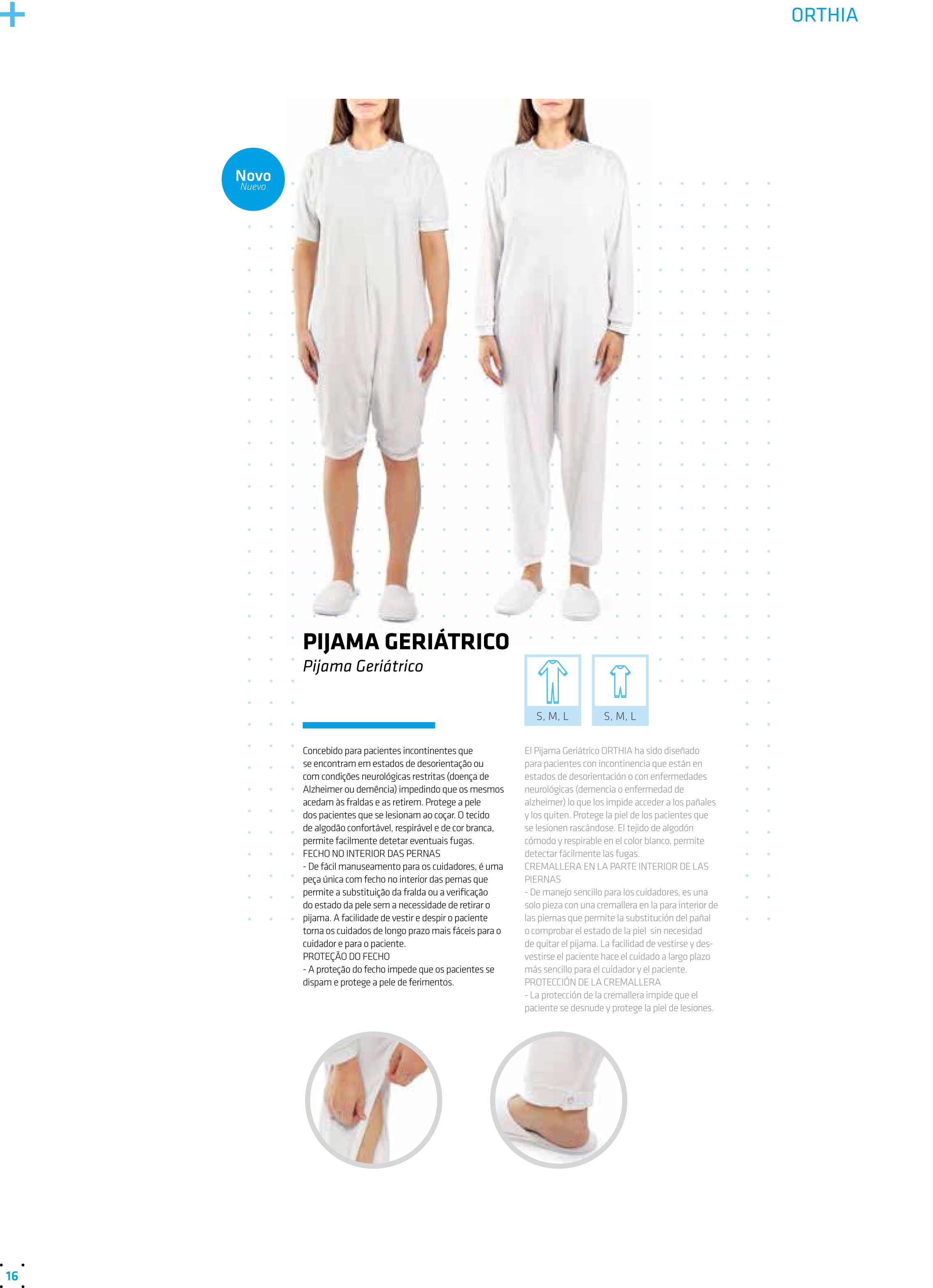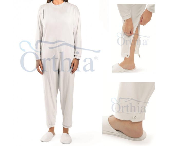 Pijama geriátrico, concebido para pacientes incontinentes que se encontram em estados de desorientação ou com condições neurológicas restritas (doença de Alzheimer ou demência), impedindo que os mesmos acedam às fraldas e as retirem. Protege a pele dos pacientes que se lesionam ao coçar. O tecido de algodão confortável, respirável e de cor branca, permite facilmente detetar eventuais fugas.