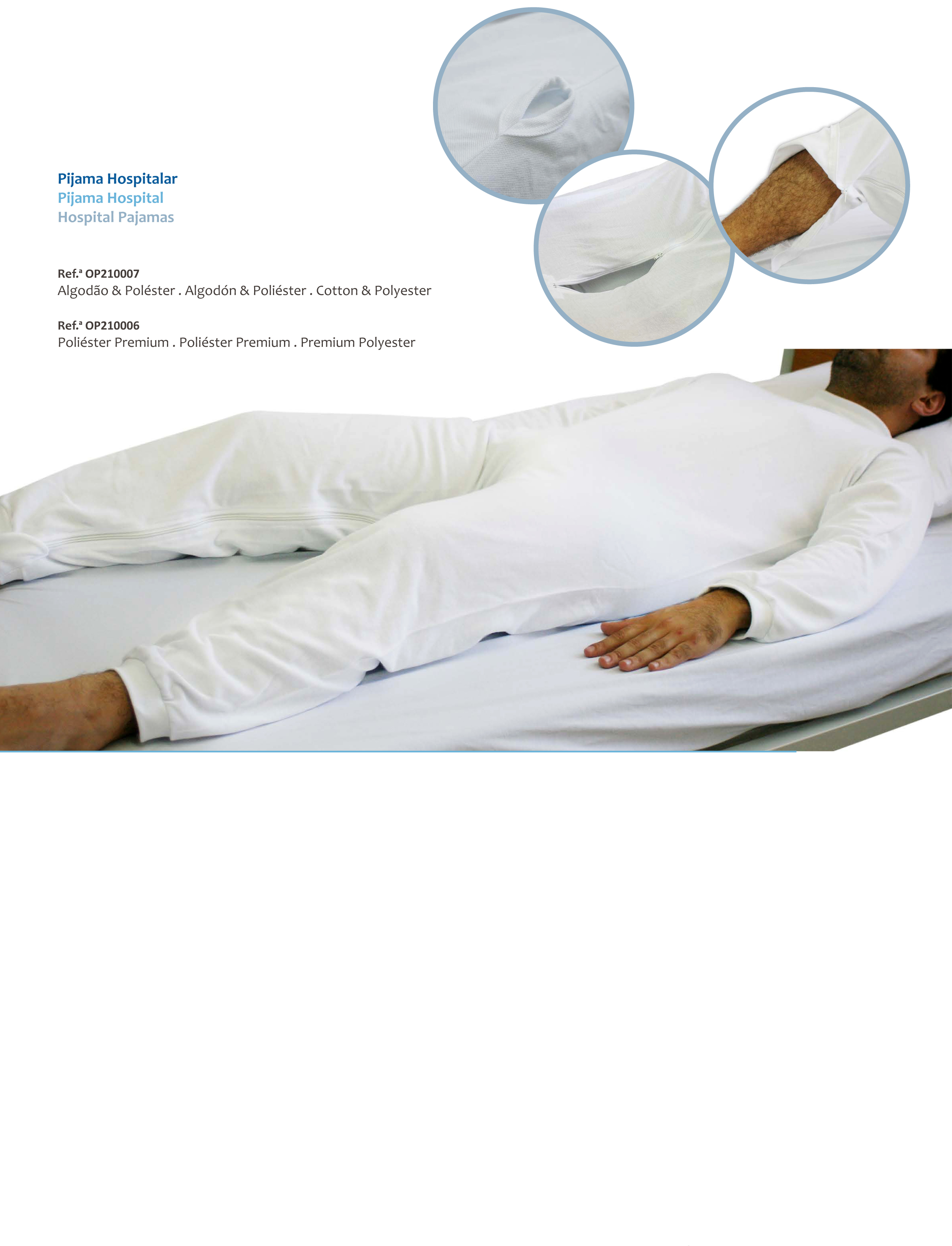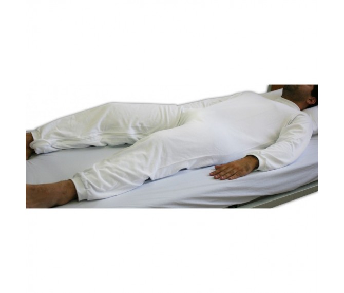 Pijama geriátrico com abertura nas pernas que permite um acesso fácil à fralda por parte do cuidador. Fabricado em algodão e poliéster. Permite uma proteção melhor da fralda, para que o utilizador não tente retirá-la.