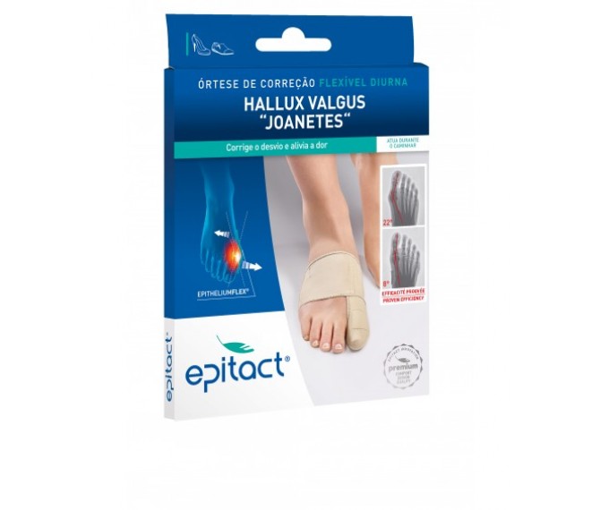 O uso diário da Órtese de Correção EPITACT® permite corrigir e limitar a evolução do "Joanete" (hallux valgus), aliviando as dores articulares. Devido à sua ergonomia patenteada que lhe confere flexibilidade e fina espessura, com tecnologia EPITHELIUMTM FLEX, a Órtese de Correção adapta-se facilmente a todo o tipo de calçado. Contrariamente ao que sucede com as órteses rígidas, a Órtese Epitact atua durante o caminhar, sobre todos os fatores que agravam a deformação.