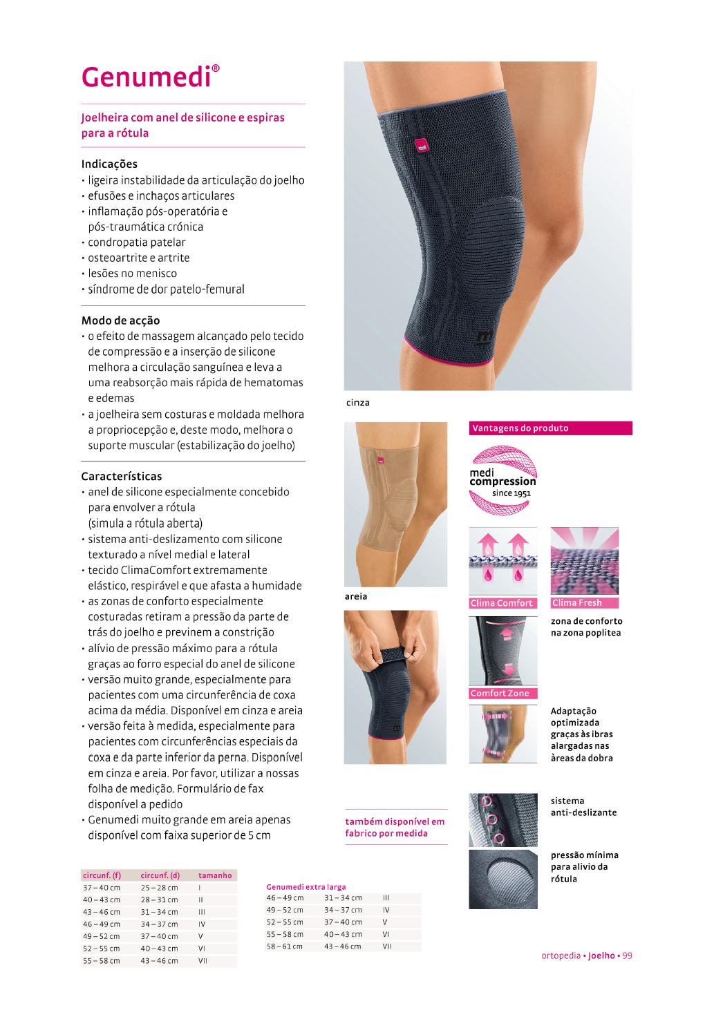 Anel de silicone especialmente concebido para envolver a rótula, sistema anti deslizamento com silicone texturado a nível medial e lateral, alívio máximo de pressão para a rótula graças ao forro especial do anel de silicone. Cor: Cinza, Areia e Preto (apenas na versão Genumedi normal).