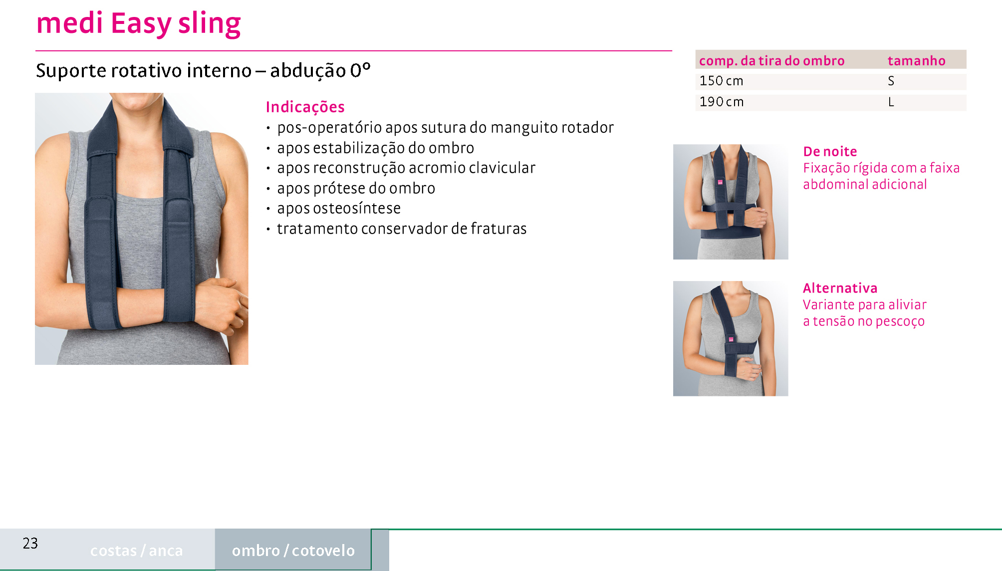 Pós-operatório após sutura do manguito rotador, após estabilização do ombro, após reconstrução acrómio-clavicular, após prótese do ombro, após osteossíntese e tratamento conservativo de fraturas.