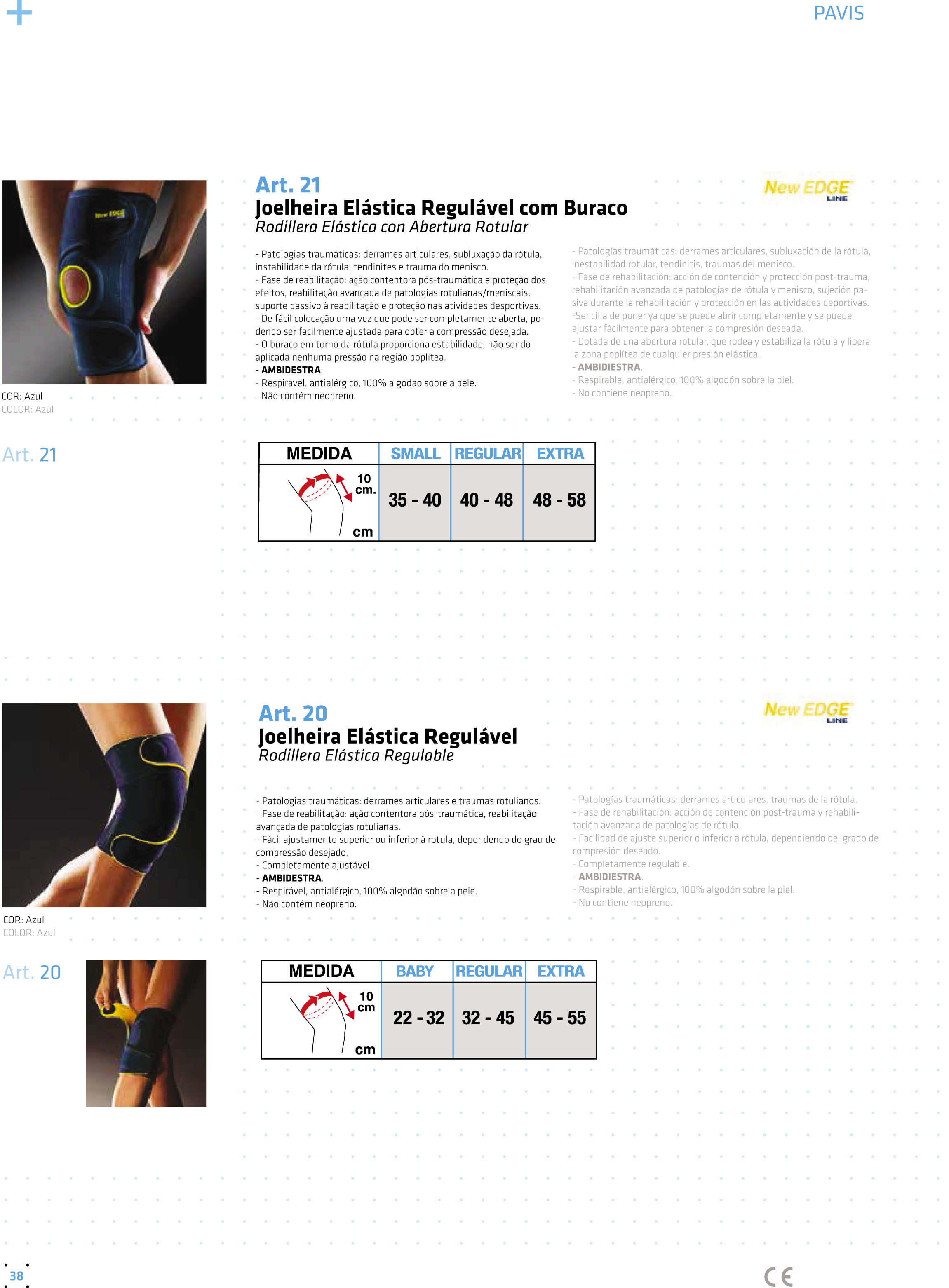 Ação contentora pós-traumática, fácil ajustamento superior ou inferior à rótula, dependendo do grau de compressão desejado.
