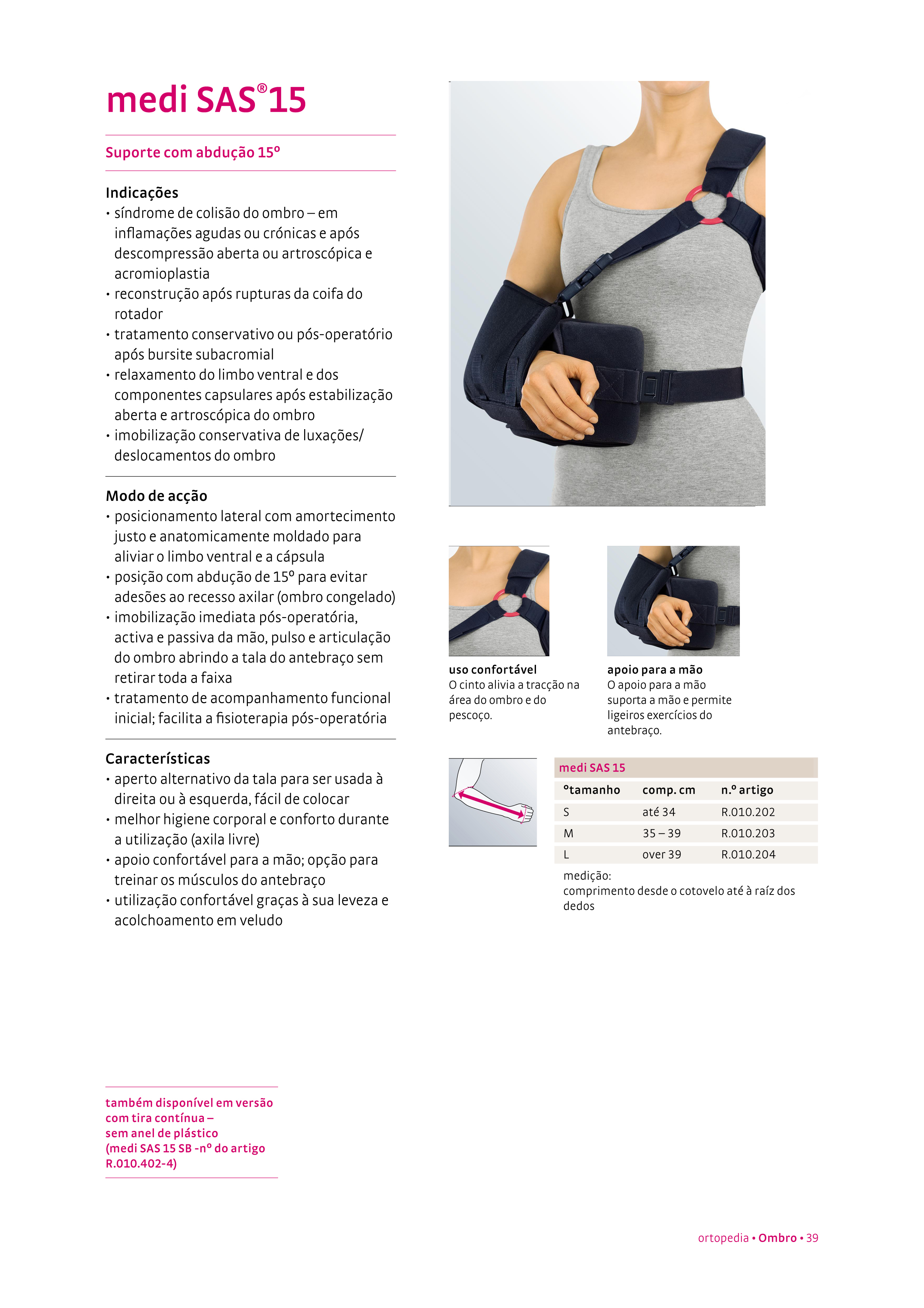 Síndrome de colisão do ombro em inflamações agudas ou crónicas e após descompressão aberta ou artroscópica e acromioplastia, reconstrução após ruturas da coifa do rotador, tratamento conservativo ou pós-operatório após bursite subacromial, relaxamento do limbo ventral e dos componentes capsulares após estabilização aberta e artroscópica do ombro, imobilização conservativa de luxações/deslocamentos do ombro.
