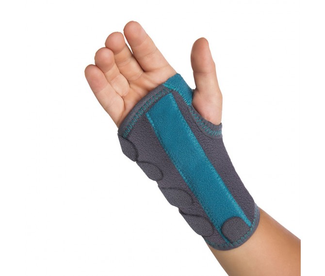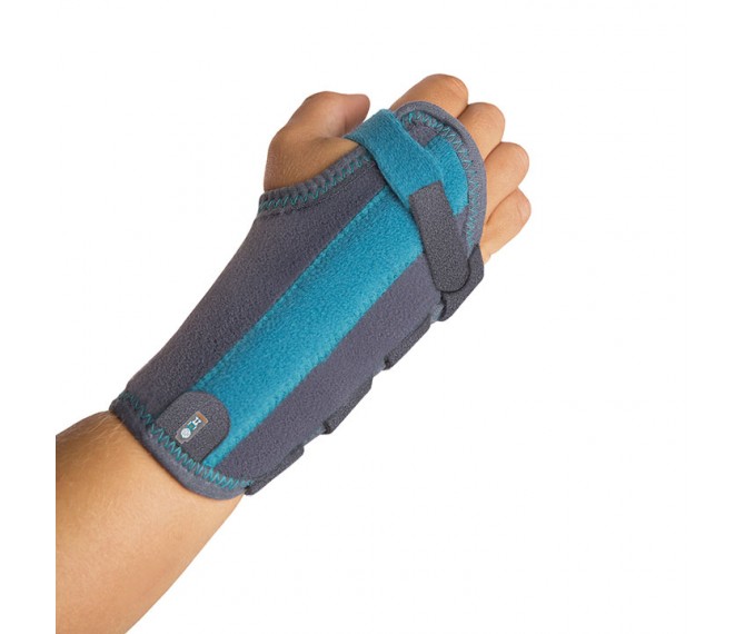 Fabricado em tecido anelado e veludo respirável e lavável, fechos de velcro para ajuste do tamanho pretendido, com uma tala palmar em alumínio maleável para imobilização da articulação do pulso na posição funcional, e outra tala em alumínio na zona posterior que providencia o suporte e rigidez suficiente para a imobilização da articulação do pulso.