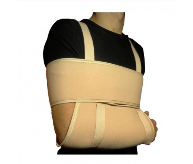 Possui bolsa com duas tiras que cruzam nas costas e fixam à frente sobre a bolsa, permitindo regular a altura do braço. A faixa torácica permite uma imobilização total do braço.