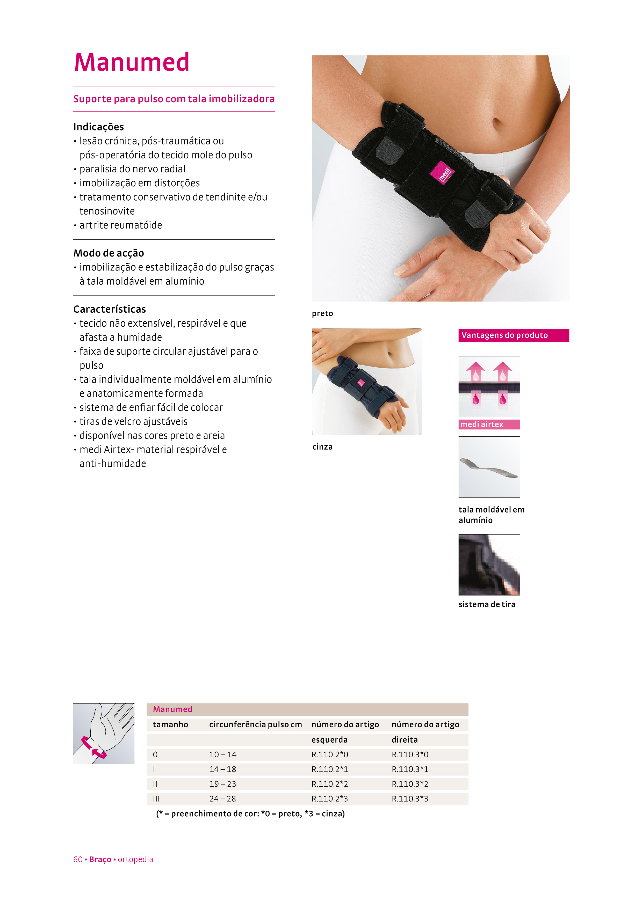 Faixa de suporte circular ajustável para o pulso, tala amovível e moldável em alumínio, fabricado em material respirável e anti humidade.