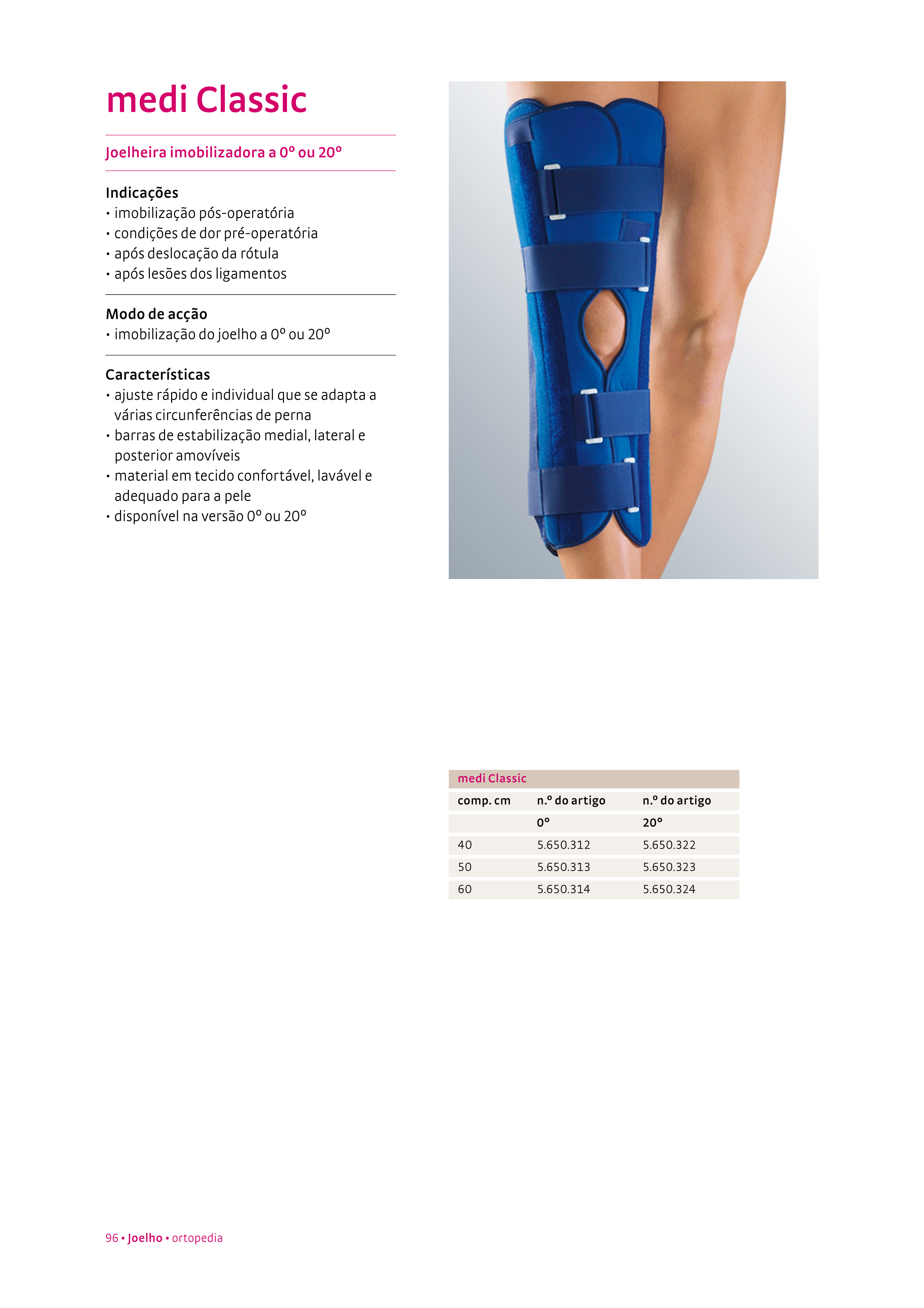 Imobilização pós-operatória, dor pré-operatória, após deslocação da rótula, após lesão dos ligamentos.