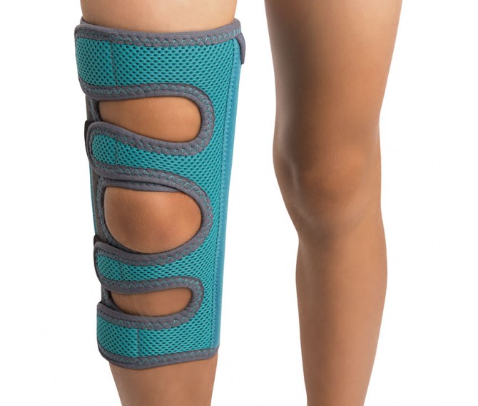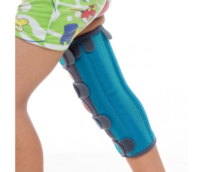 Fabricado em tecido anelado e veludo respirável, com forro interior em algodão TERRY, com fechos de velcro para ajuste do tamanho pretendido, com talas na zona posterior e lateral para uma imobilização em extensão, as talas laterais podem ser postas em duas posições diferentes, conforme as características do paciente ( devem estar paralelas à articulação do joelho).