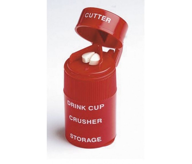 Este triturador, cortador e caixa de comprimidos (3 em 1) ajuda a quebrar os comprimidos de forma fácil e confortável quando os pacientes têm dificuldade em engoli-los.