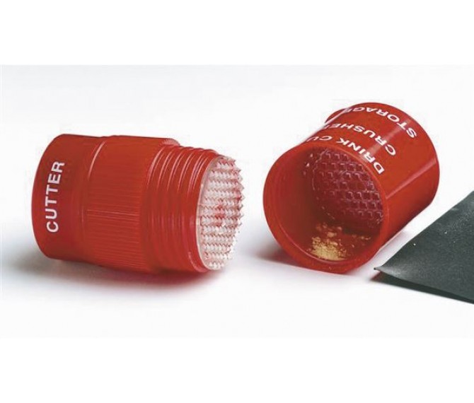 Possui tampa de rosca para maior precisão, depósito para guardar os comprimidos e lâmina de corte e base rugosa para tornar a moagem mais precisa.